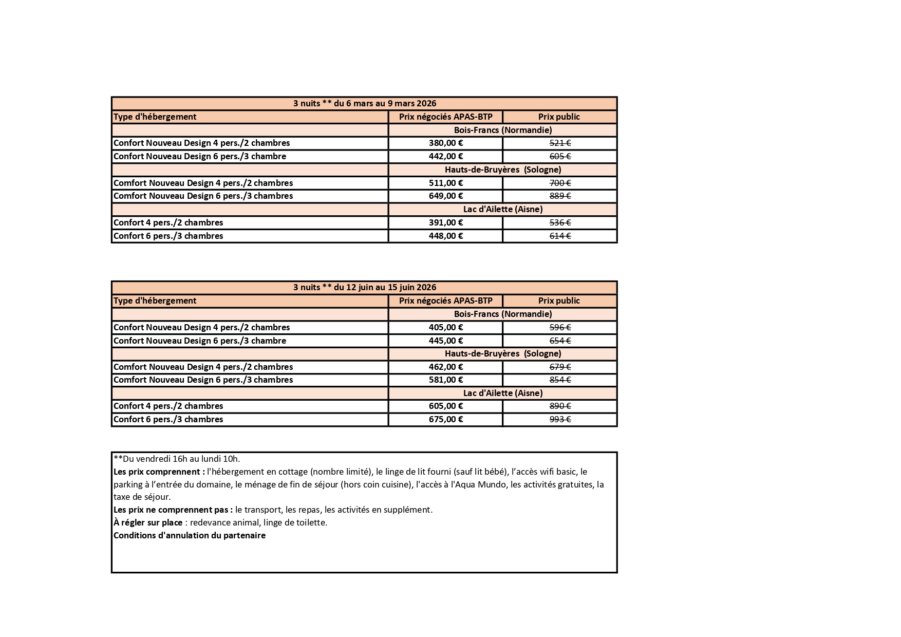 Tarifs en location par cottage et par séjour ( 4 jours/ 3 nuits)