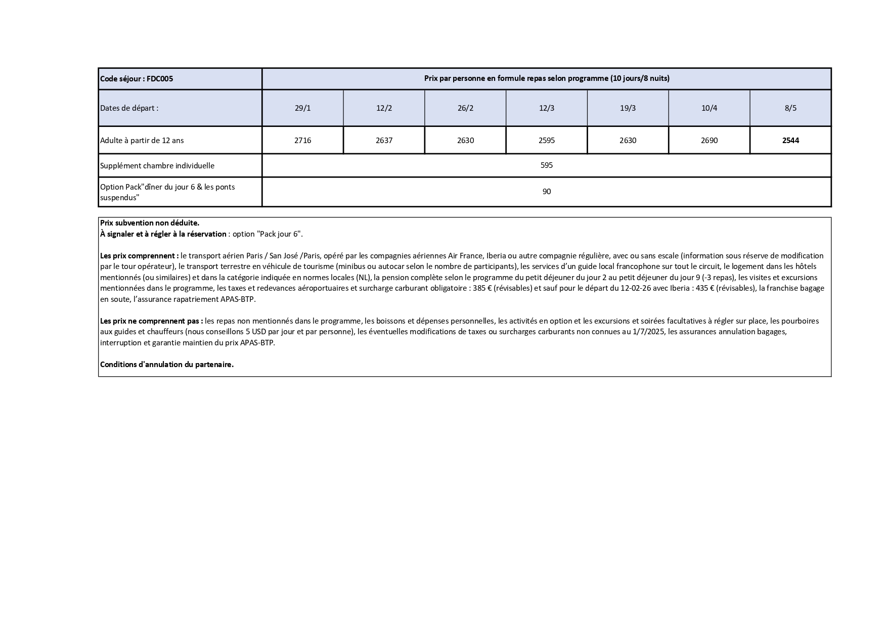 Tarifs en formule repas selon programme par personne (10j/8n)