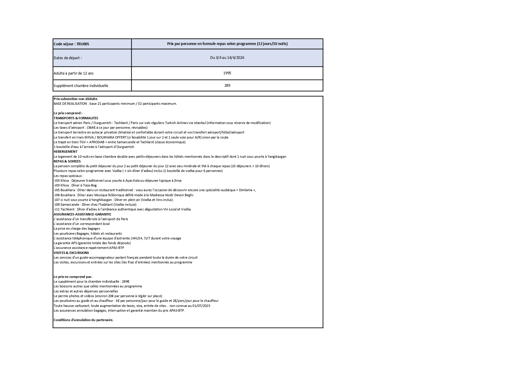 -Le transport aérien Paris / Ourguentch - Tachkent / Paris sur vols réguliers Turkish Airlines via Istanbul (information sous réserve de modification)