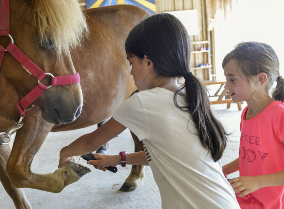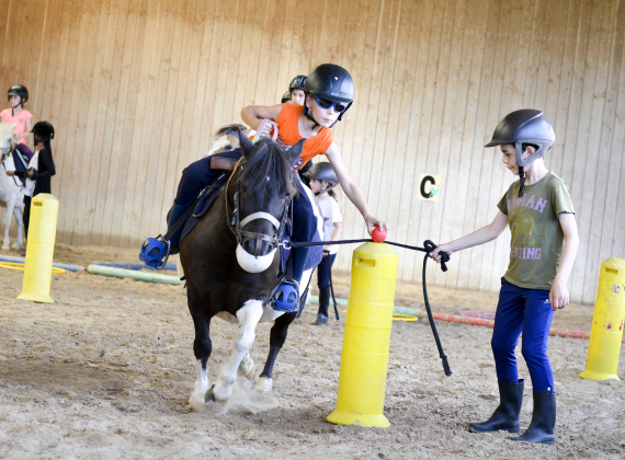 Équitation (2 heures/jour) : activité sur poneys de toutes tailles en carrière, en manège et en rond de voltige avec des ateliers adaptés à chaque niveau pour une approche pédagogique et ludique : soins et hippologie ; bases de l'équitation ; jeux ; voltiges et balades.