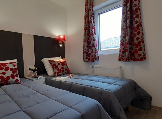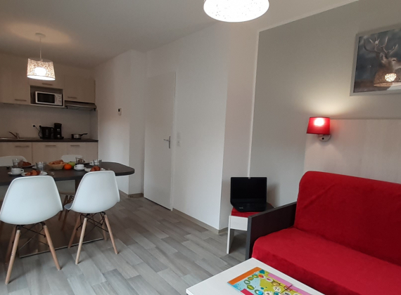 3 pièces 6 personnes (45 m² environ) : séjour avec canapé-lit convertible 2 couchages, TV, coin cuisine équipé (3 plaques vitrocéramiques, four micro-ondes grill, lave-vaisselle, hotte aspirante, réfrigérateur avec partie congélateur, cafetière et bouilloire électrique, grille-pain), petit balcon ou terrasse avec 2 chiliennes, salle de bain avec WC. Une chambre avec 2 lits simples, une chambre avec un lit double.