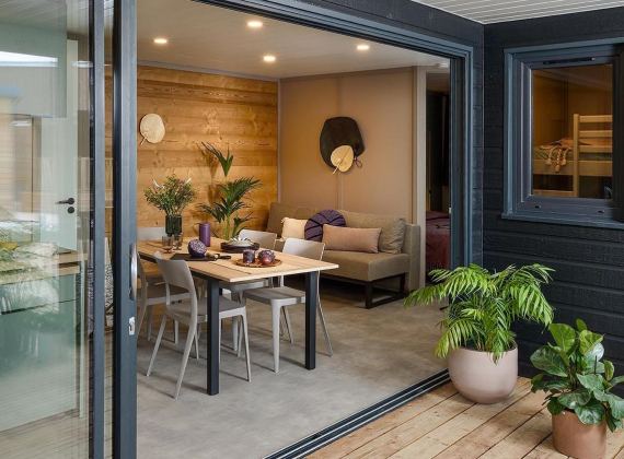 Bungalow Luxe 4/6 pers. climatisé (env. 45 m² terrasse incluse): salon avec canapé-lit, TV, cuisine équipée avec plaque de cuisson, réfrigérateur, micro-ondes, grille-pain, machine à café à capsules, 1 chambre avec 1 lit double, 1 chambre avec 2 lits simples, salle de bain avec douche, wc, terrasse couverte avec mobilier de jardin.