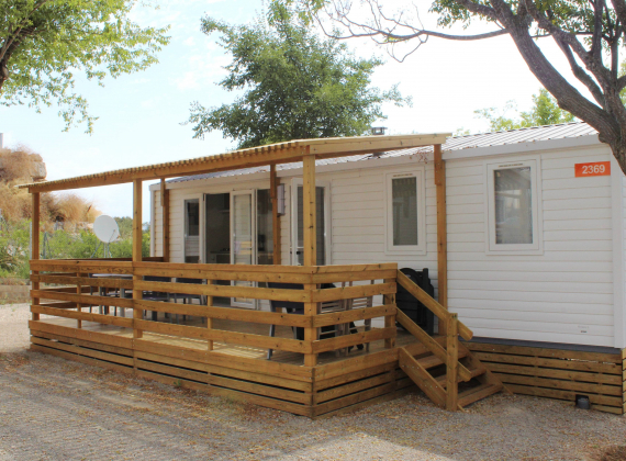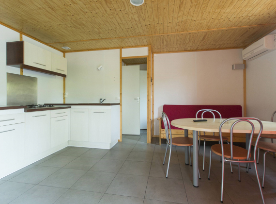 Mobil home 6 personnes climatisé (env. 49 m² terrasse incluse): coin salon avec banquette, TV, cuisine équipée avec plaque de cuisson, réfrigérateur, grille-pain, micro-ondes, cafetière électrique, 1 chambre avec 1 lit double, 2 chambres avec 2 lits simples, salle de bain avec douche, lavabo, wc séparé, terrasse couverte avec mobilier de jardin en bois.