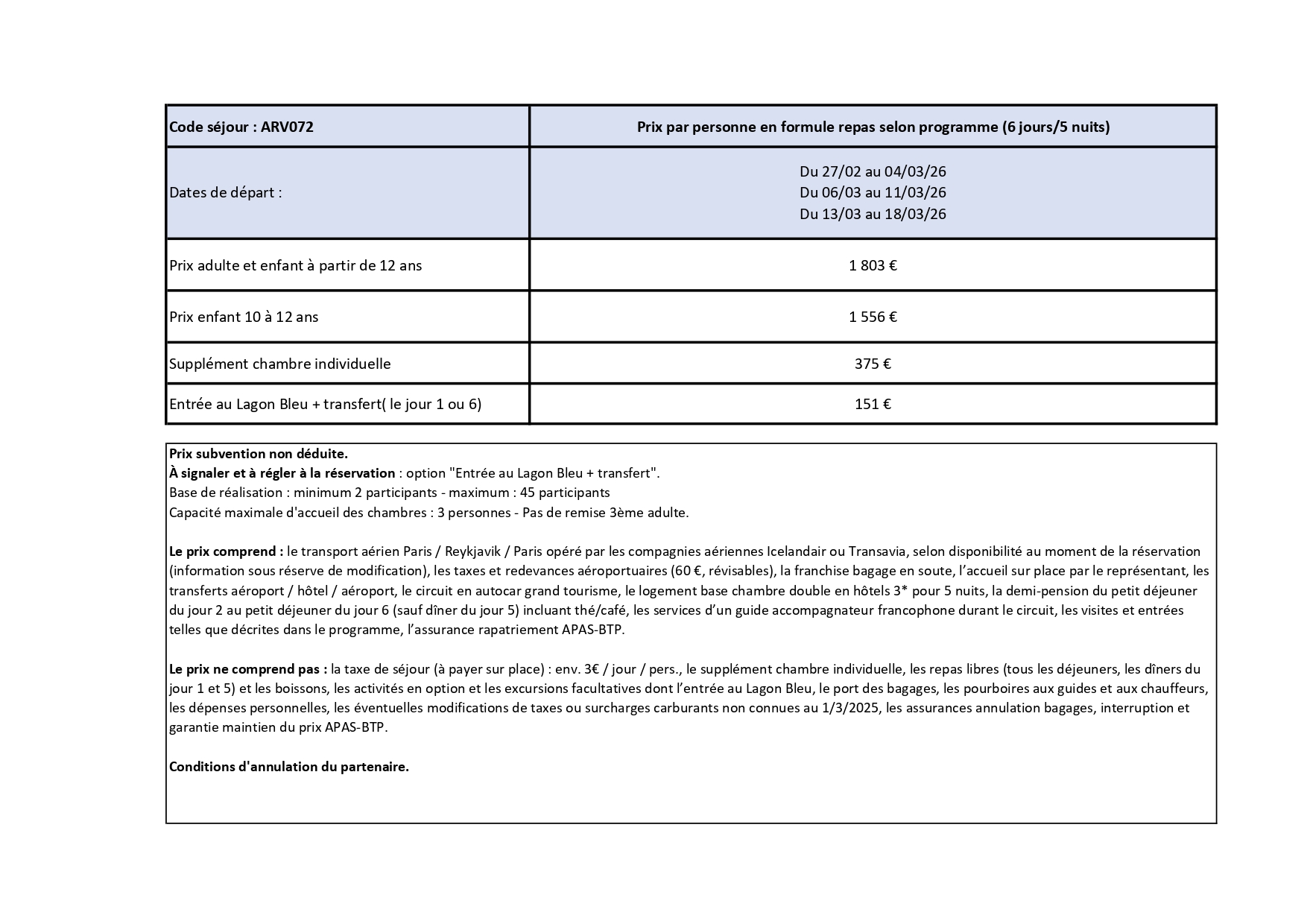 - Le transport aérien Paris / Reykjavik / Paris opéré par les compagnies aériennes Icelandair ou Transavia, selon disponibilité au moment de la réservation (information sous réserve de modification)