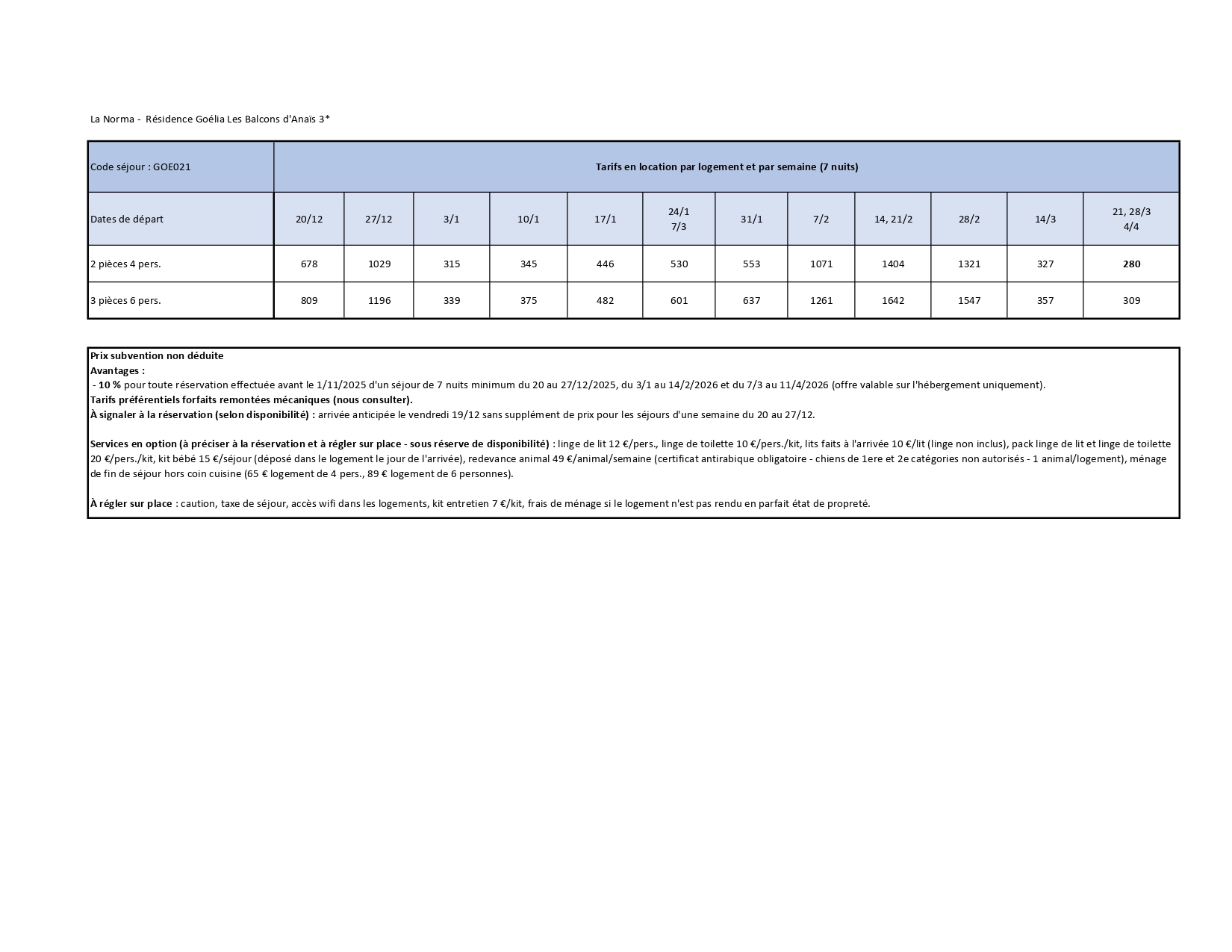 Réservez-vite : - 10 % pour toute réservation effectuée avant le 1/11/2025 d'un séjour de 7 nuits minimum du 20 au 27/12/2025, du 3/1 au 14/2/2026 et du 7/3 au 11/4/2026 (offre valable sur l'hébergement uniquement).