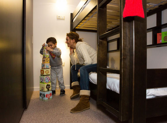 Chambre de 4 pers. (16/21 m² env.) : 2 lits simples ou 1 lit double et 2 lits superposés séparés par une grande armoire.
