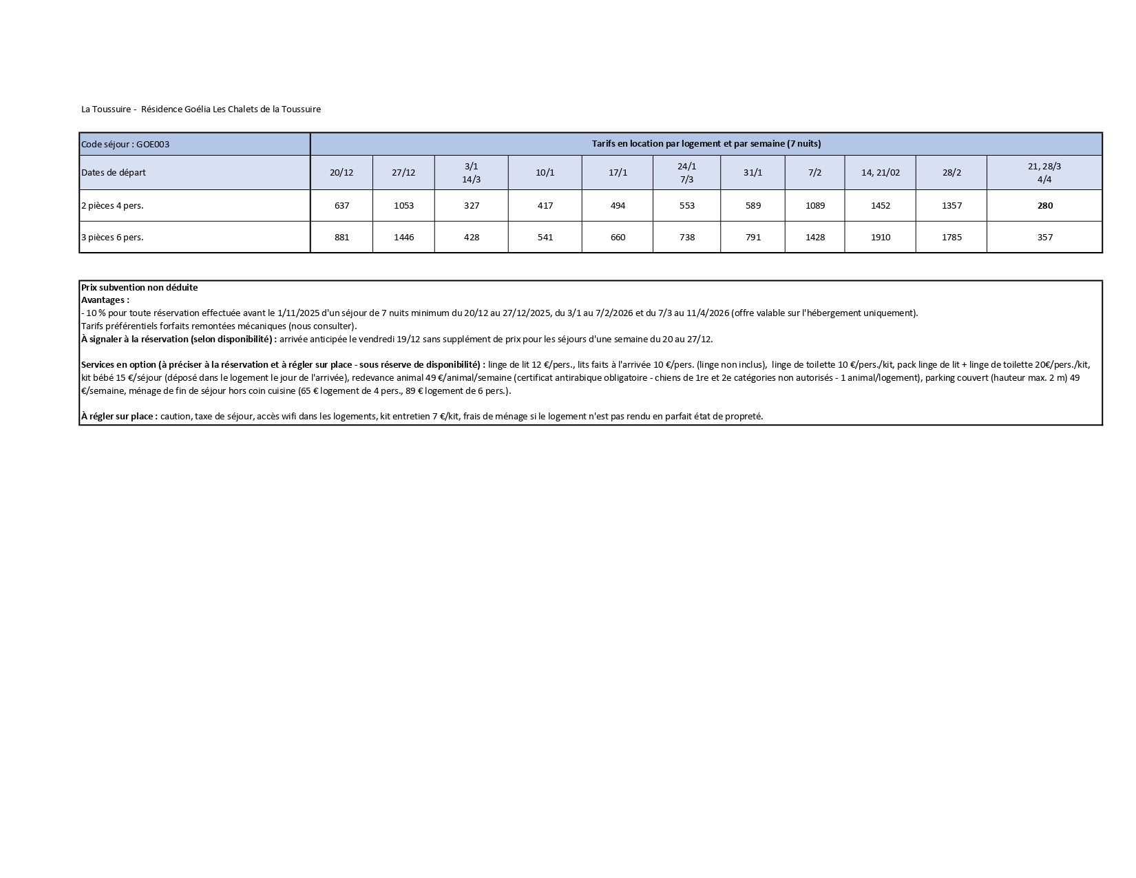 Réservez-vite :- 10 % pour toute réservation effectuée avant le 1/11/2025 d'un séjour de 7 nuits minimum du 20/12 au 27/12/2025, du 3/1 au 7/2/2026 et du 7/3 au 11/4/2026 (offre valable sur l'hébergement uniquement).