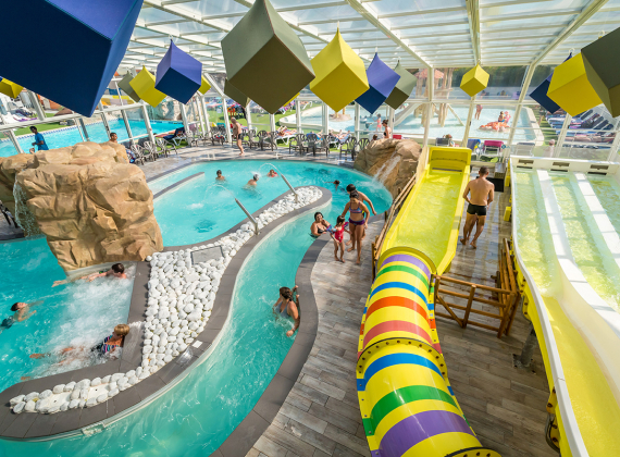 - L'espace aquatique couvert vous offre détente et amusement avec ses deux piscines, 4 pistes de toboggans, lagon de nage et ses 2 pataugeoires dont une aqualudique pour les plus petits.