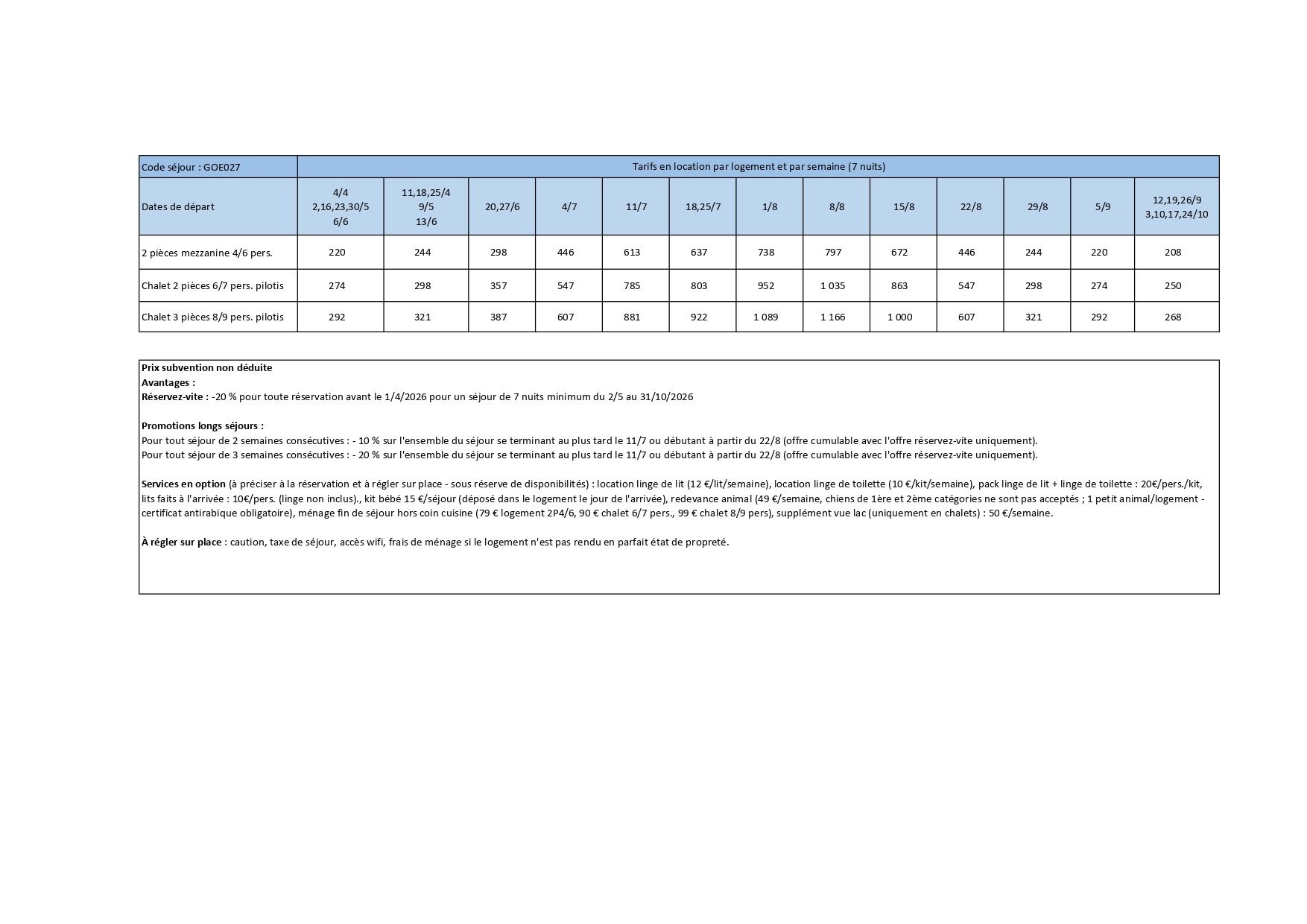 Location linge de lit, lits faits à l'arrivée (linge non inclus), location linge de toilette, pack linge de lit + linge de toilette, ménage de fin de séjour (Si le logement n'est pas laissé en parfait état de propreté, ou si le vacancier préfère ne pas l'effectuer - En tout état de cause, le logement doit être rendu avec la kitchenette propre, vaisselle lavée et rangée)