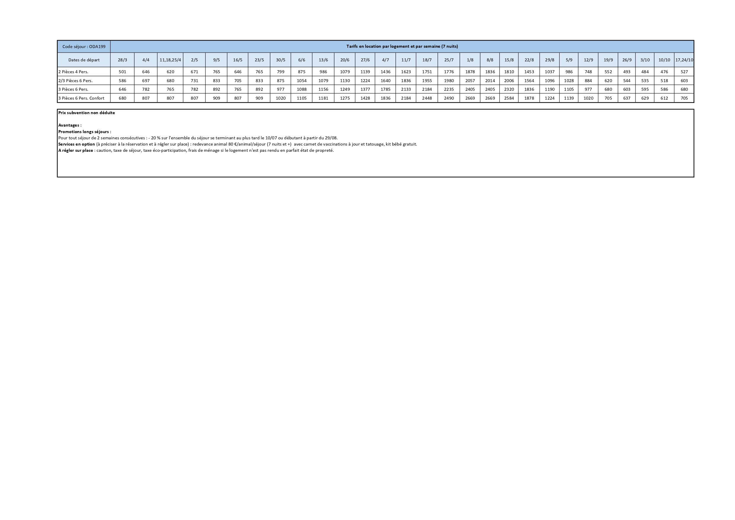 Tarif en location par hébergement, par semaine
