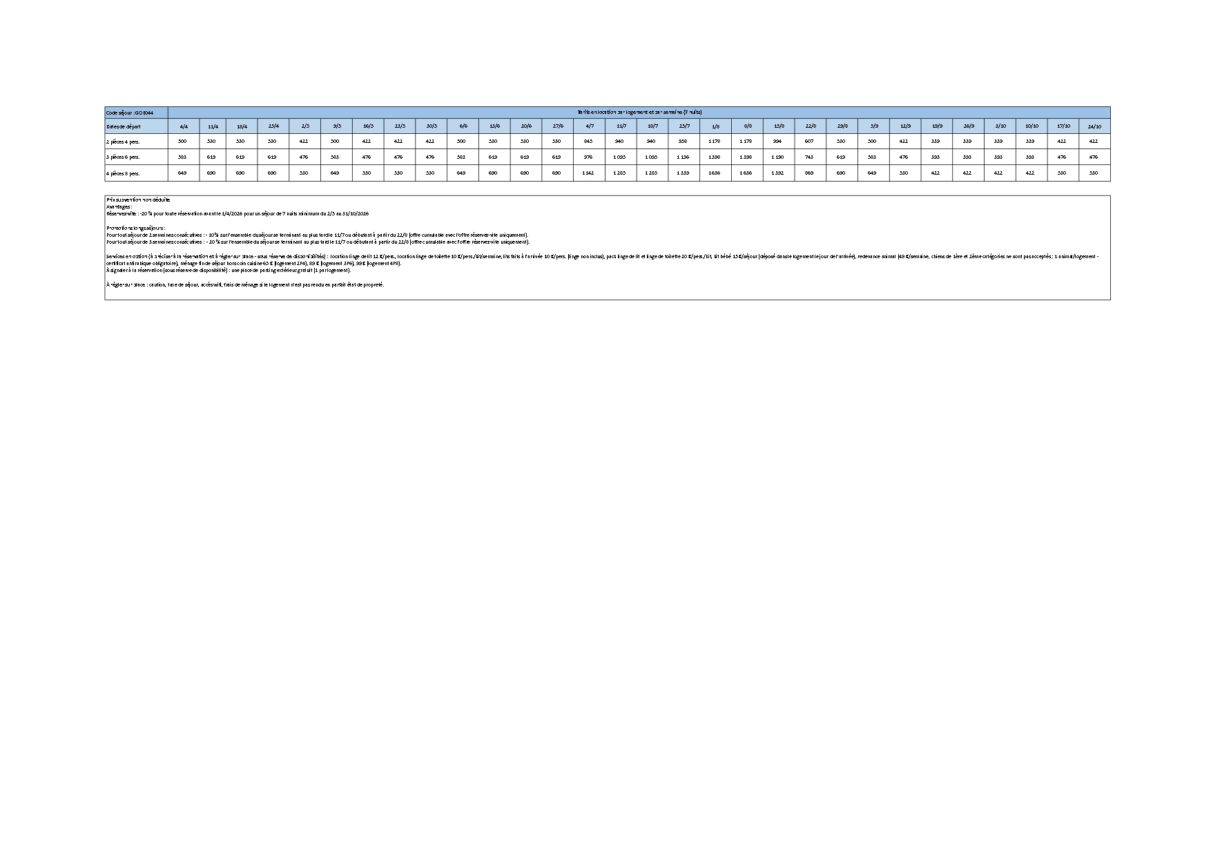 Tarifs en location par logement et par semaine (7 nuits)
