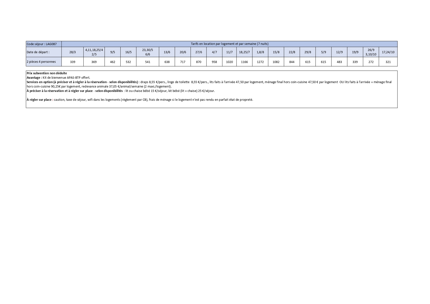 Tarifs en location par logement et par semaine (7 nuits)