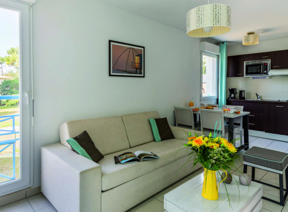 Votre logement 2 Pieces 4 Personnes (32 m² env.) est équipé de : un séjour avec un canapé-lit 2 personnes, une télévision, une kitchenette (avec micro-ondes/grill, plaques vitrocéramiques + lave-vaisselle), une chambre 1 lit 2 personnes, une salle de bains. En étage avec balcon ou en rez-de-chaussée avec terrasse.