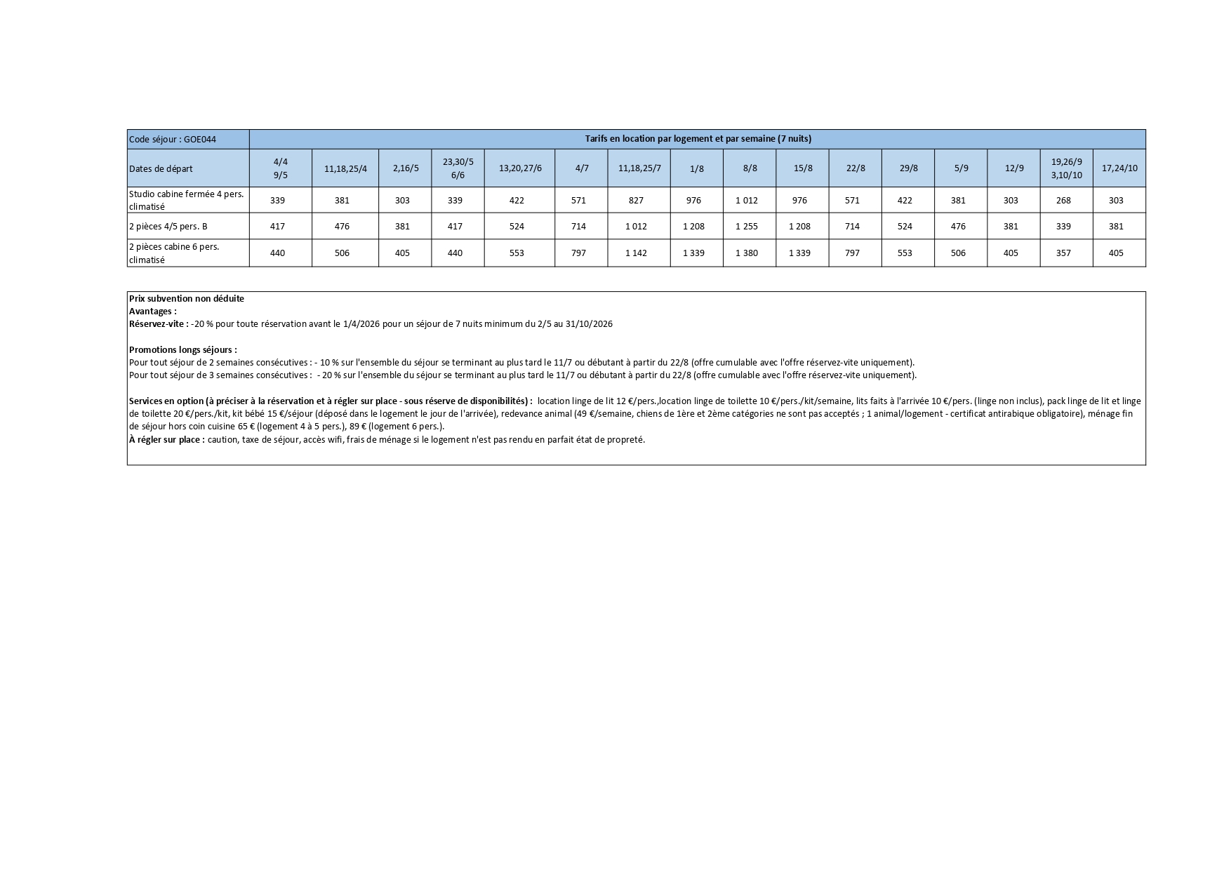 Location linge de lit, lits faits à l'arrivée (linge non inclus), location linge de toilette, pack linge de lit + linge de toilette, ménage de fin de séjour (Si le logement n'est pas laissé en parfait état de propreté, ou si le vacancier préfère ne pas l'effectuer - En tout état de cause, le logement doit être rendu avec la kitchenette propre, vaisselle lavée et rangée)