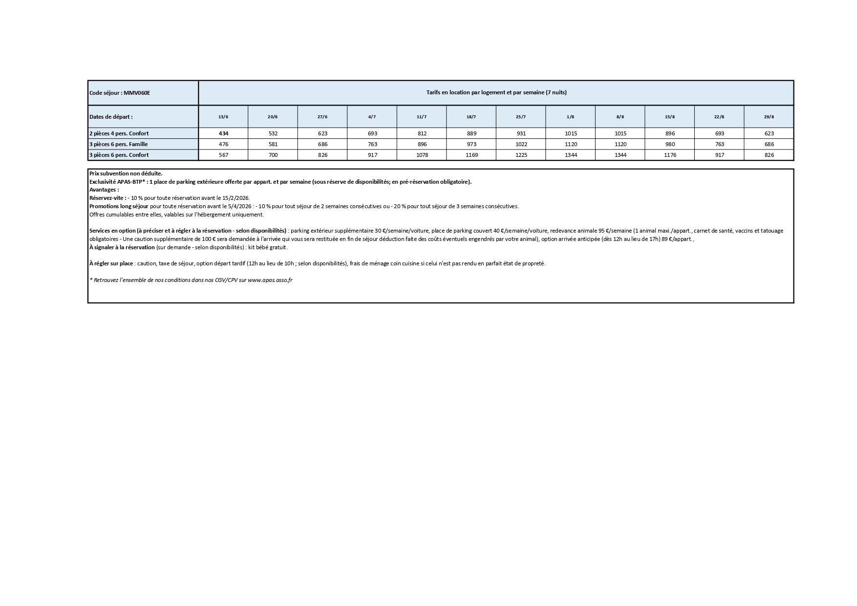 Promotion long séjour : pour toute réservation avant le 5/4/2026, - 10 % pour tout séjour de 2 semaines consécutives ou - 20 % pour tout séjour de 3 semaines consécutives.