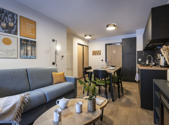 Dans tous les logements : séjour avec canapé-lit convertible 2 personnes, coin cuisine équipé (avec plaques vitrocéramiques, lave-vaisselle, combiné four micro-ondes, réfrigérateur, cafetière à filtre, bouilloire), TV, salle de bains (baignoire ou douche) avec sèche-cheveux, WC. Balcon ou terrasse.