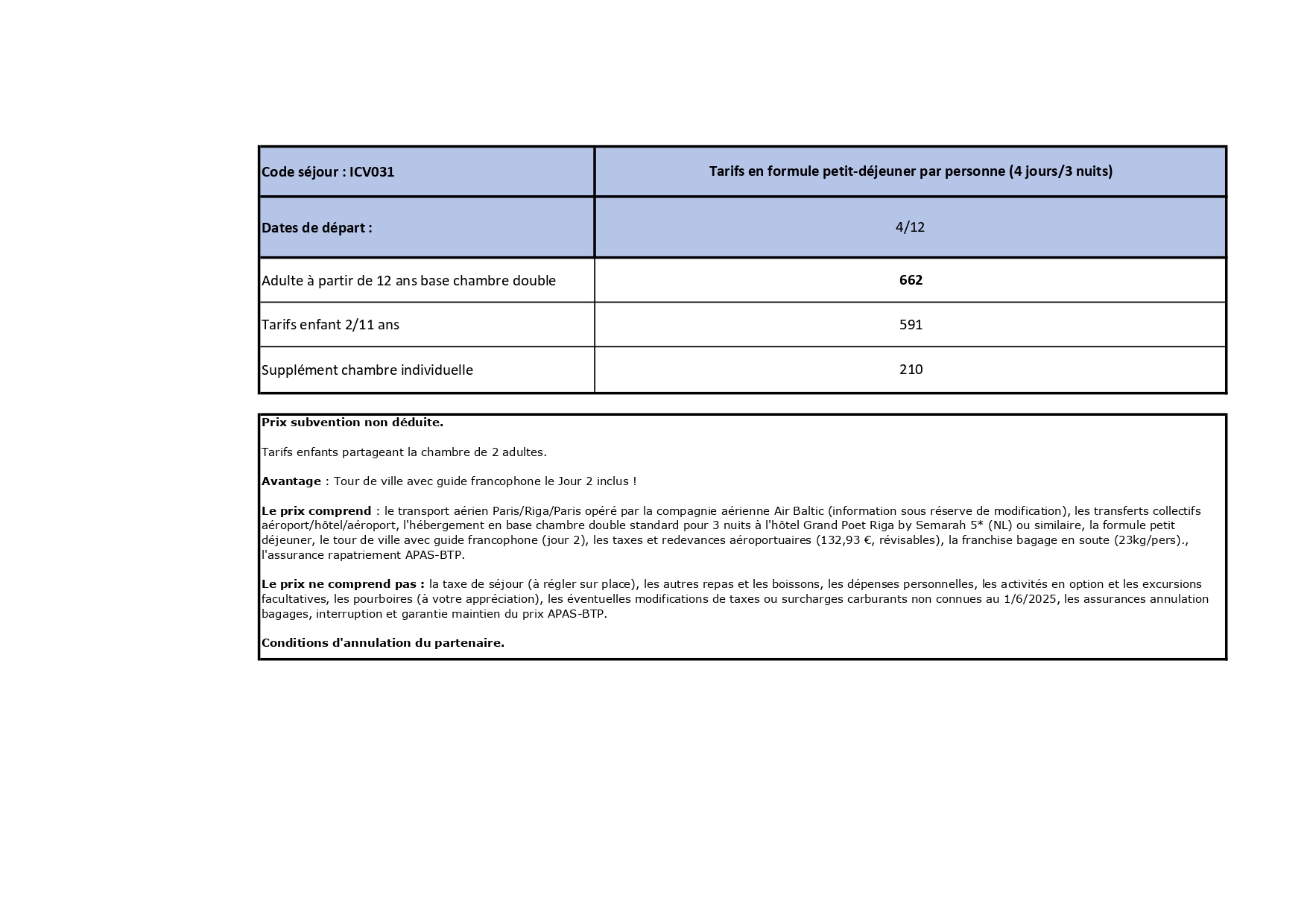 Le transport aérien Paris/Riga/Paris opéré par la compagnie aérienne Air Baltic (information sous réserve de modification), les transferts collectifs aéroport/hôtel/aéroport, l'hébergement en base chambre double standard pour 3 nuits à l'hôtel Grand Poet Riga by Semarah 5* (NL) ou similaire, la formule petit déjeuner, le tour de ville avec guide francophone (jour 2), les taxes et redevances aéroportuaires (132,93 €, révisables), la franchise bagage en soute (23kg/pers)., l'assurance rapatriement APAS-BTP.